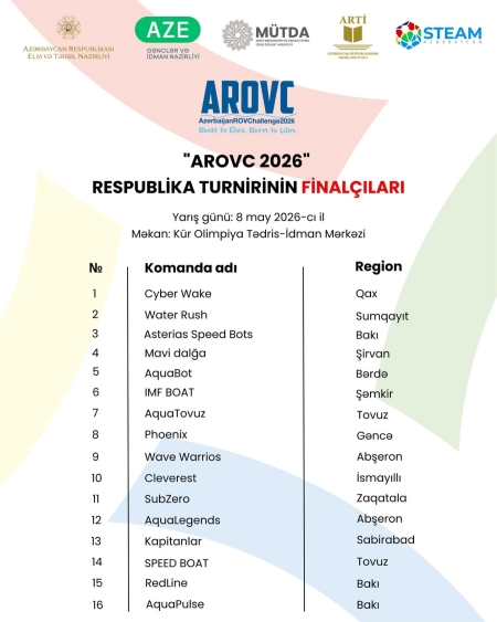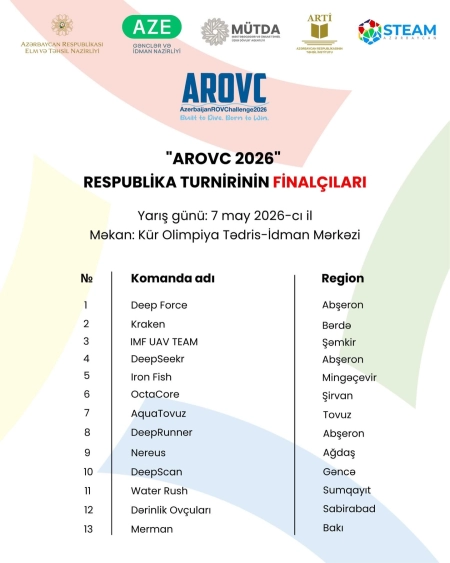 "AROVC 2026 (Məsafədən idarəolunan sualtı dron və suüstü gəmi)" Respublika turnirinin final mərhələsinə vəsiqə qazanan komandalar bəlli oldu!