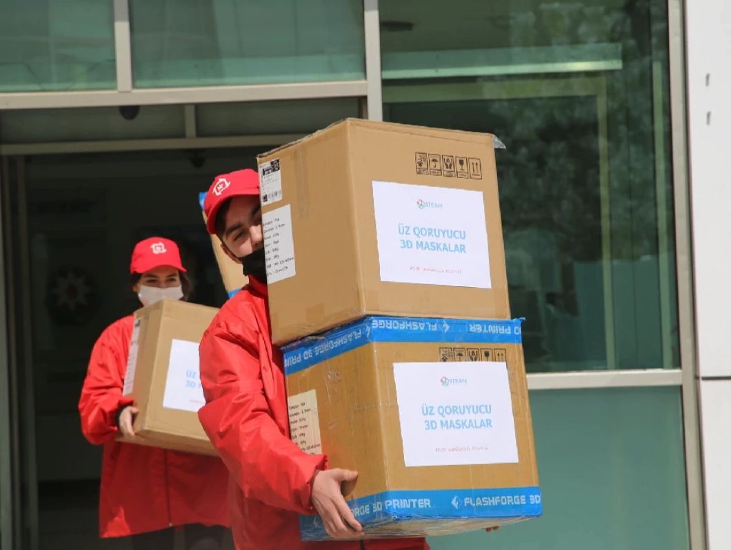"STEAM Azerbaijan" layihəsi çərçivəsində istehsal olunan yüzlərlə "üz sipəri" Təhsil Nazirliyinin “BİR Könüllü"lərinin dəstəyi ilə Azərbaycan Respublikası Daxili İşlər Nazirliyi Tibb İdarəsinin A.Heydərov adına Respublika Hospitalına təqdim edilib.